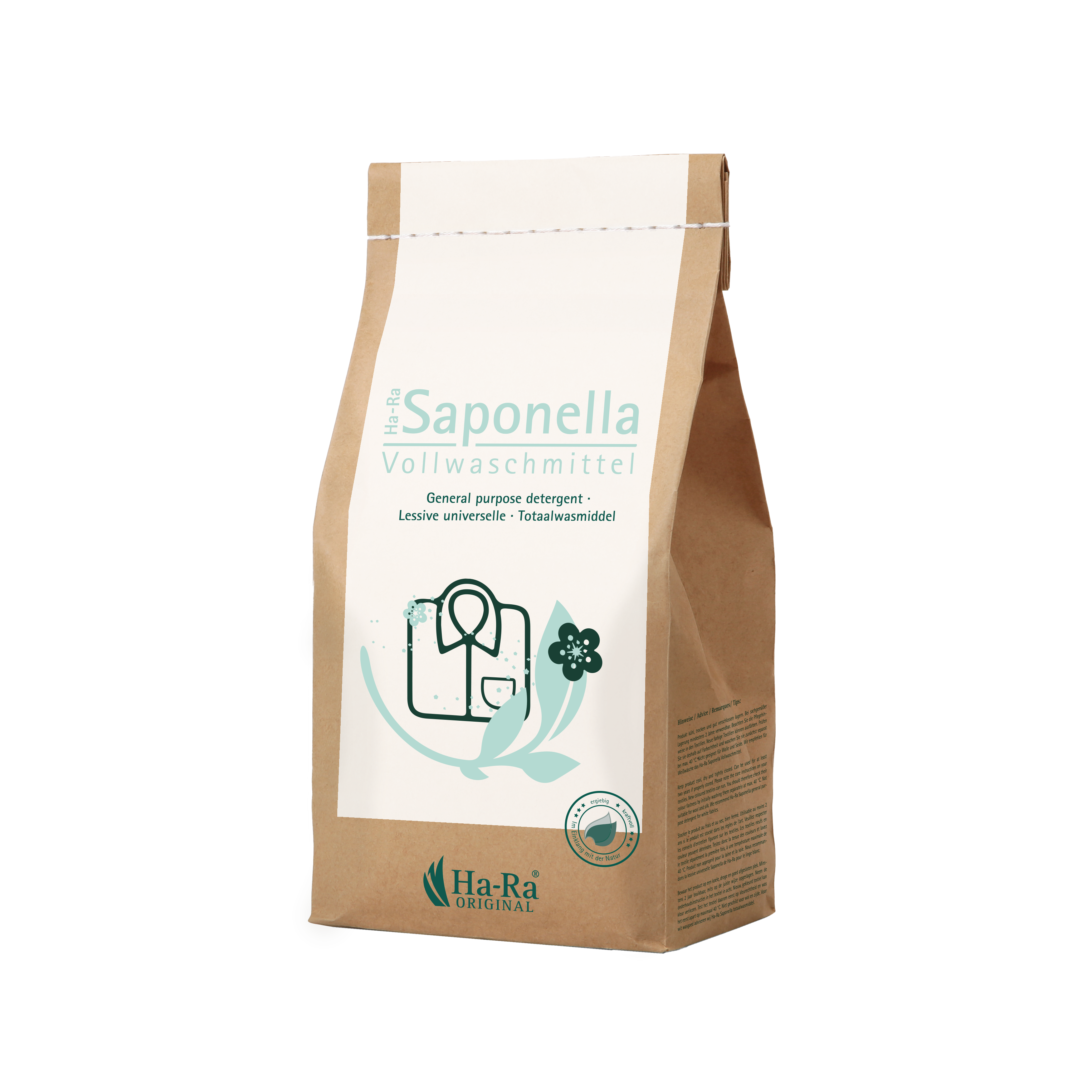Voor het wassen van witgoed in de wasmachine. Speciaal afgestemd op de reiniging van Ha-Ra-vezels. Niet geschikt voor wol en zijde. TIP: Voor gekleurd wasgoed raden wij het Ha-Ra Saponella Color wasmiddel aan.